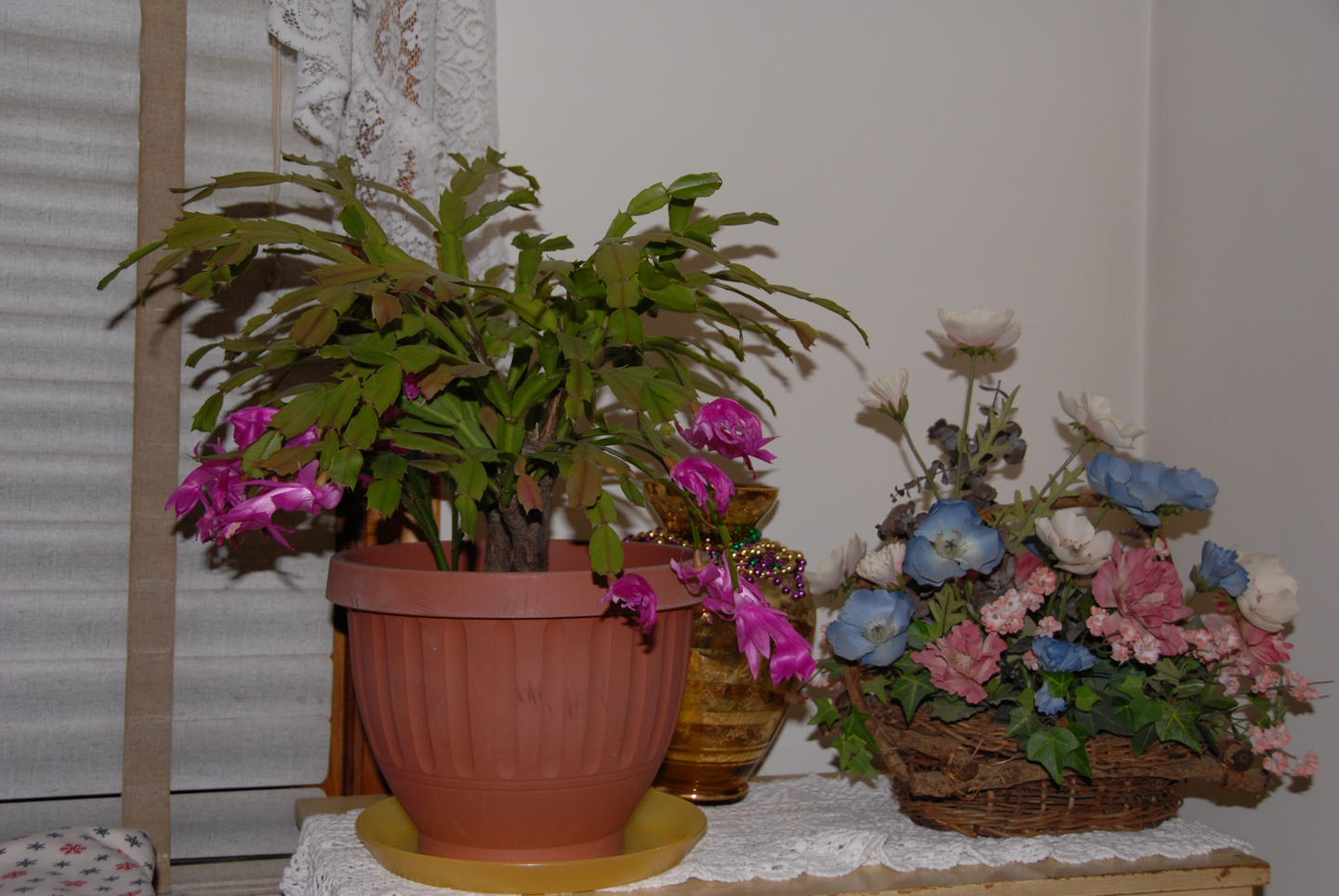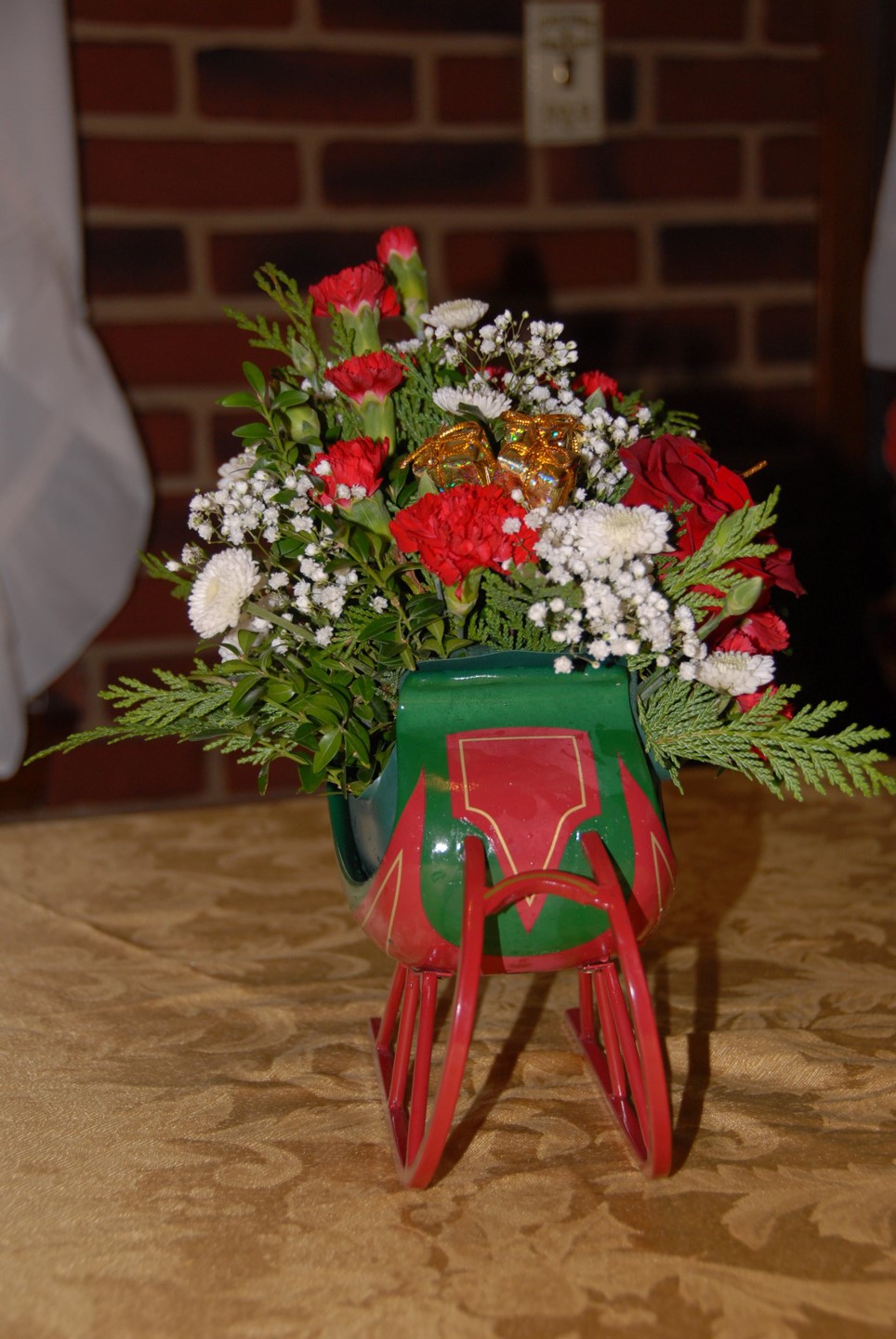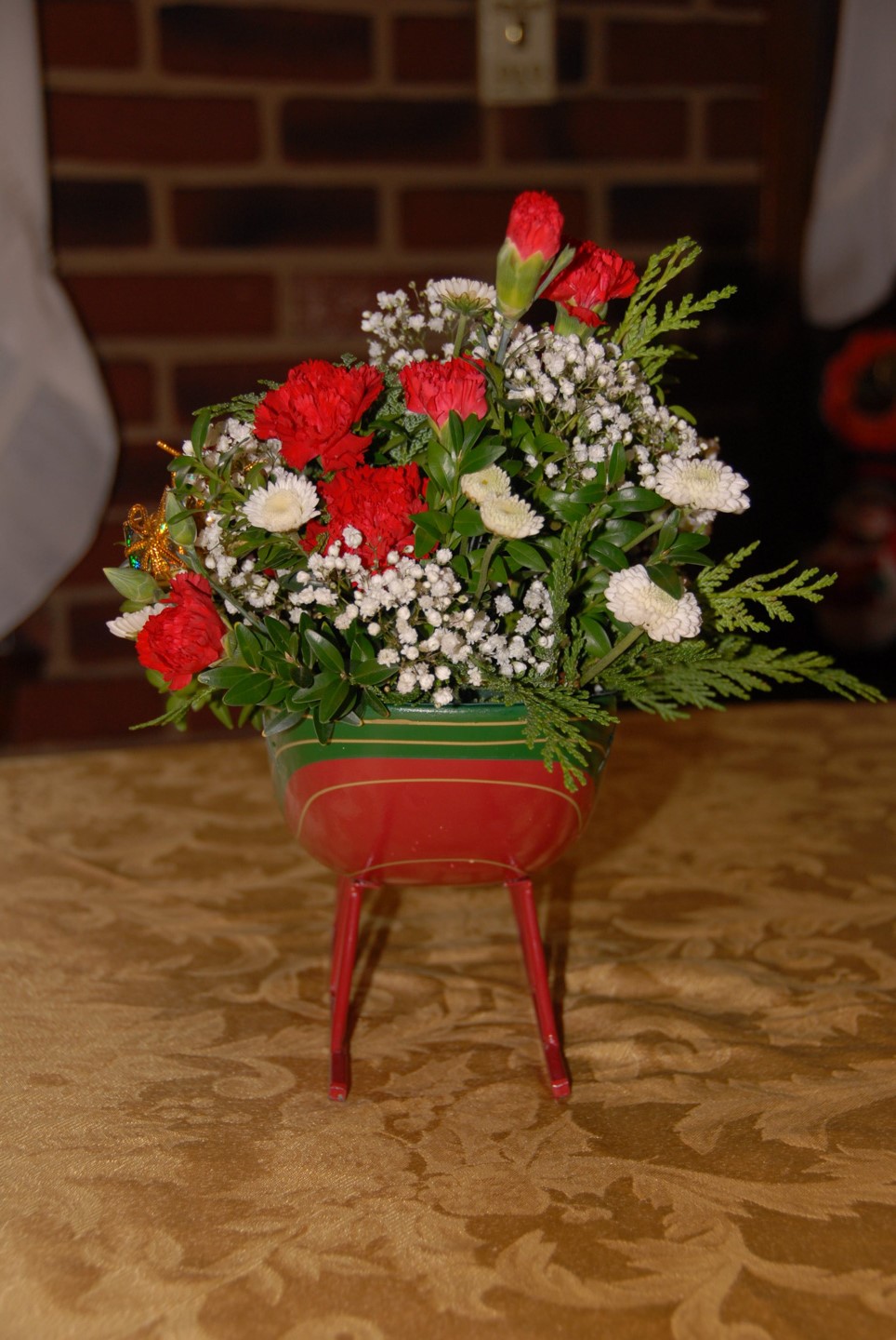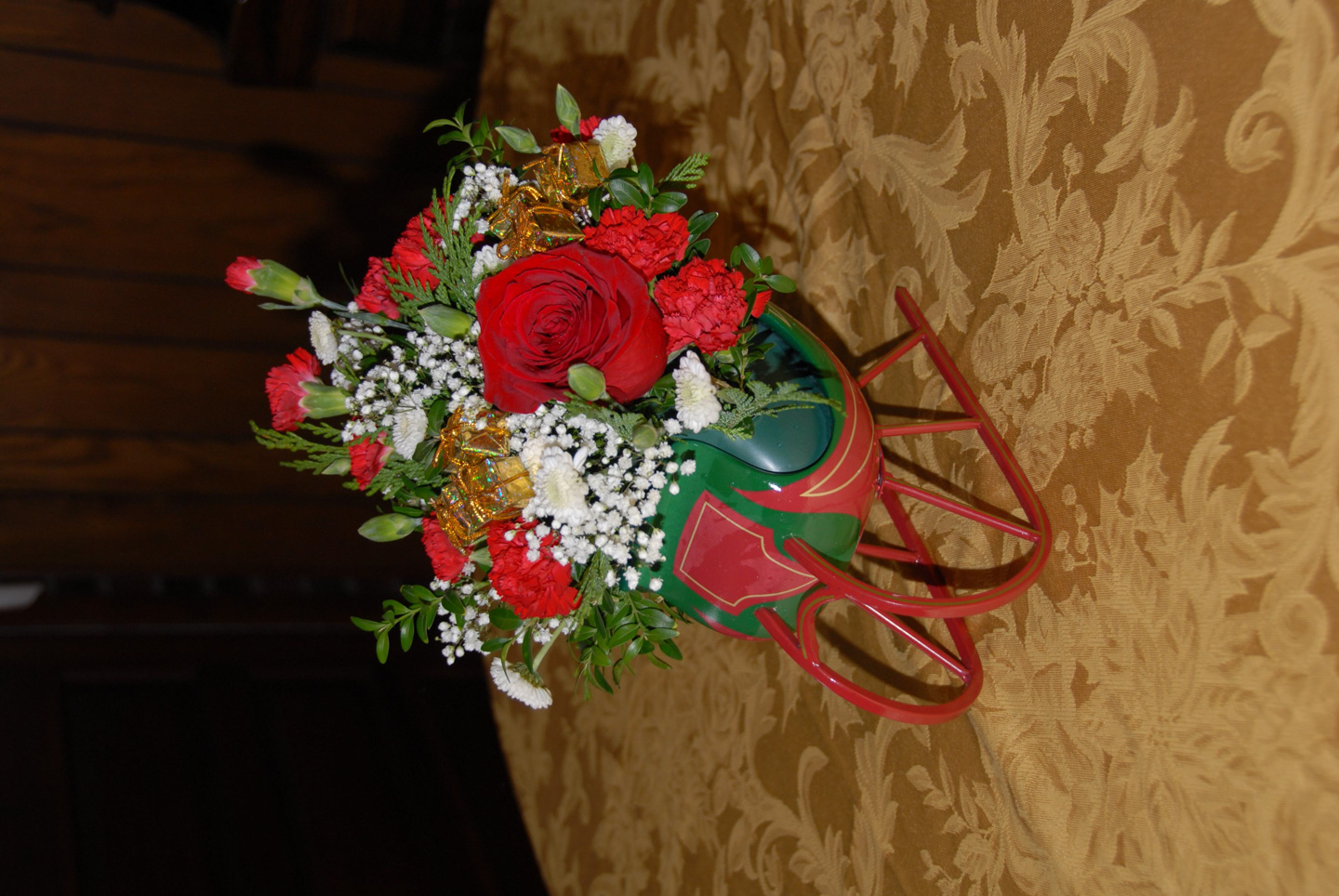 And the flower arrangement sent by Steve (a relative in Pennsylvania): side/front, front, & back views. The sleigh is a solid one.