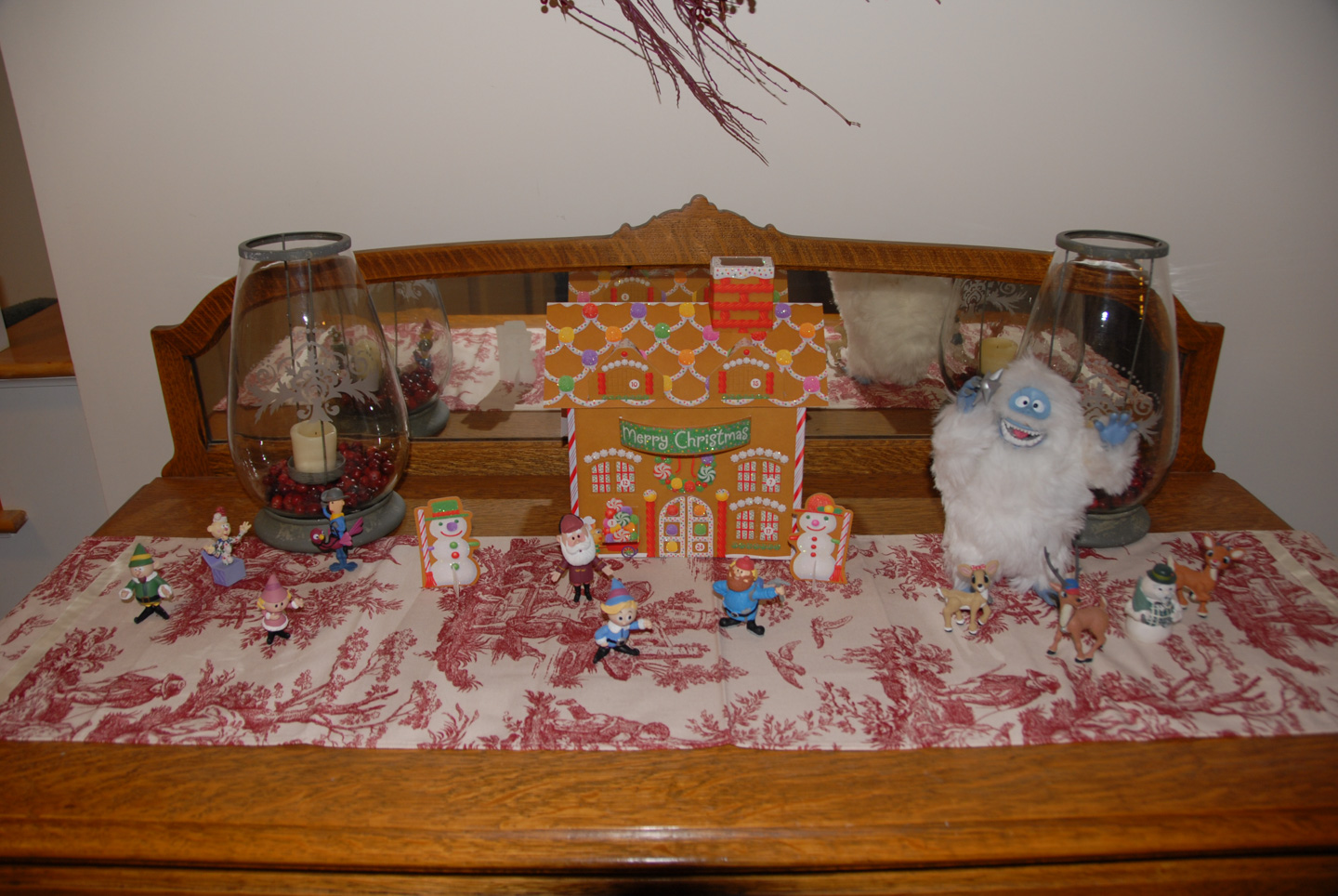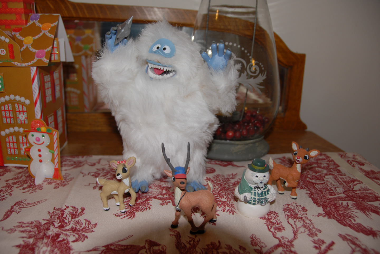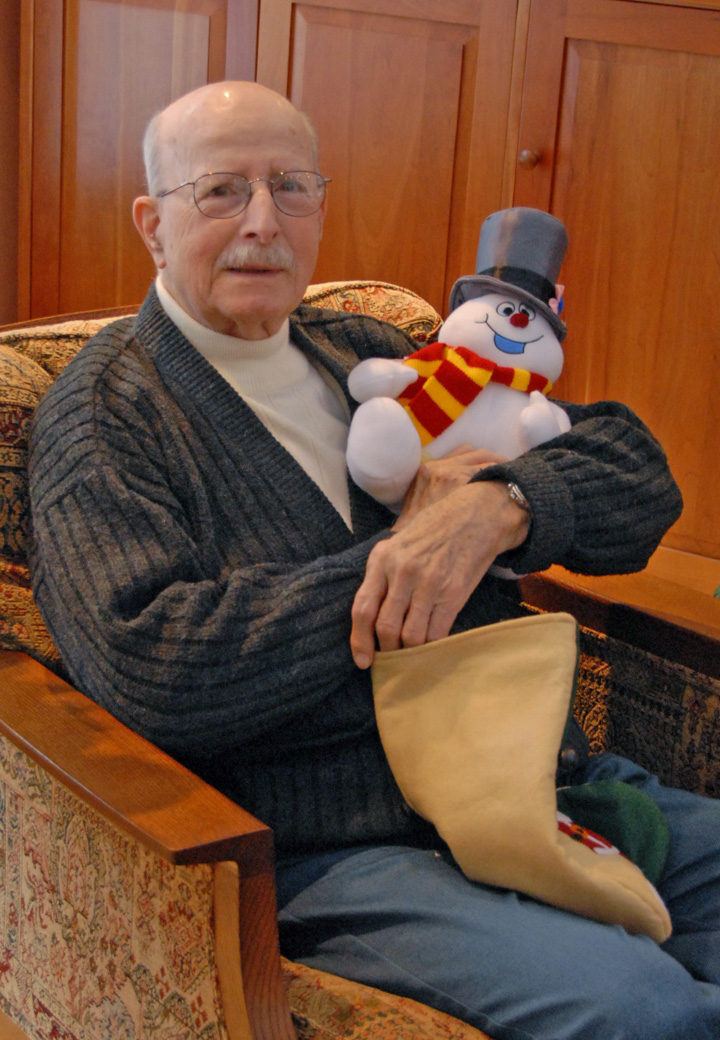 Nicki is showing off a package. And Gerry is showing off the Frosty stocking stuffer. (Both Gerry and Frosty are strikingly handsome, I think.)