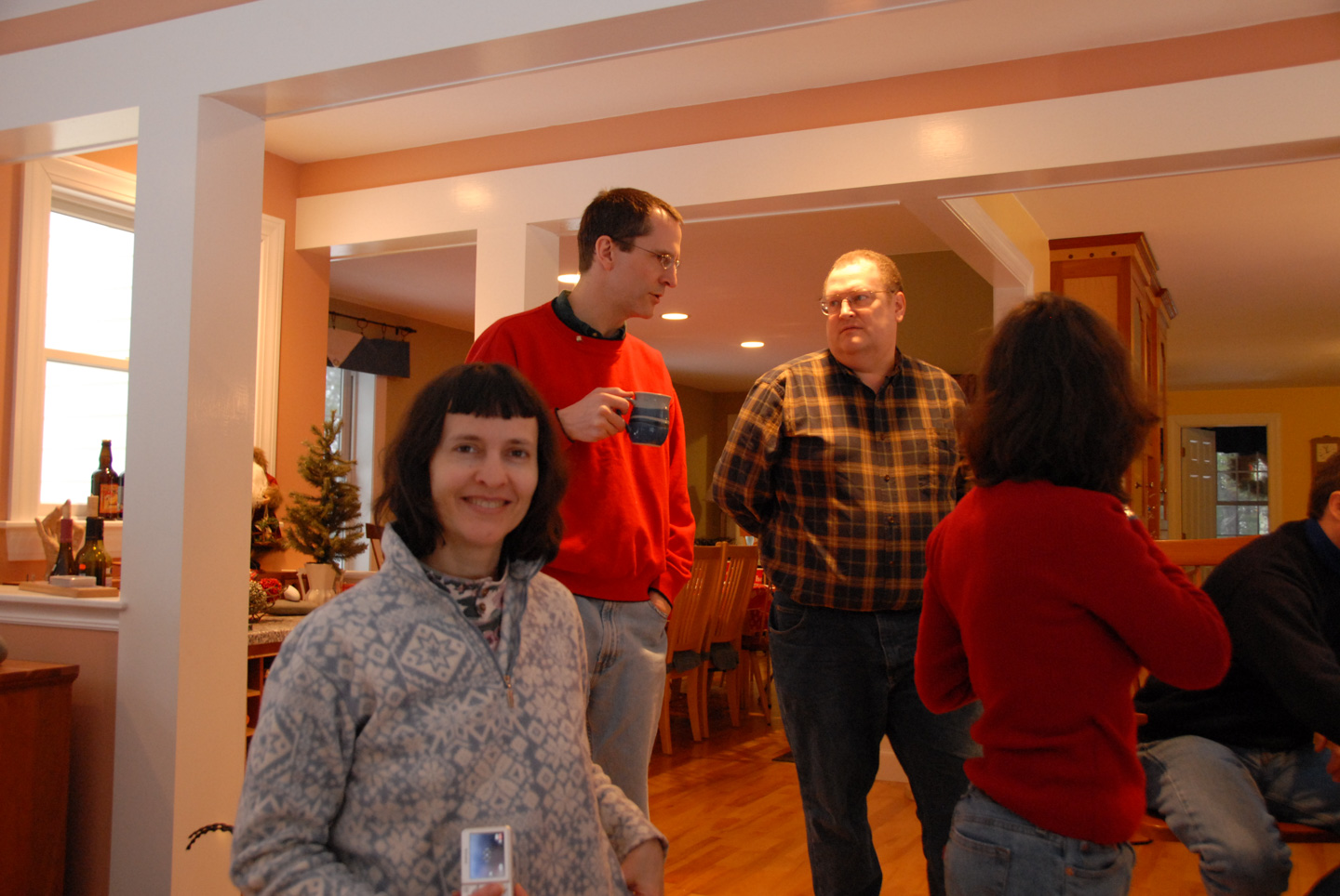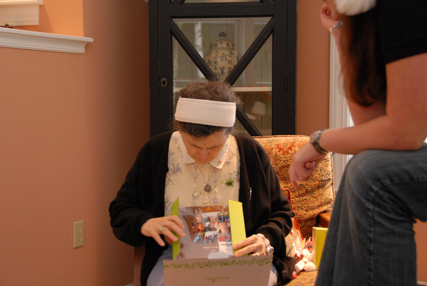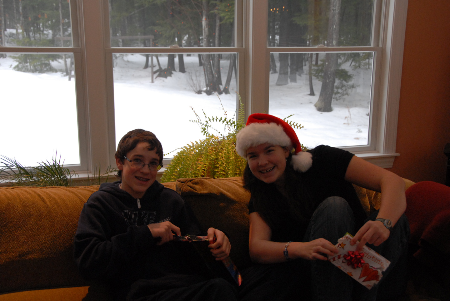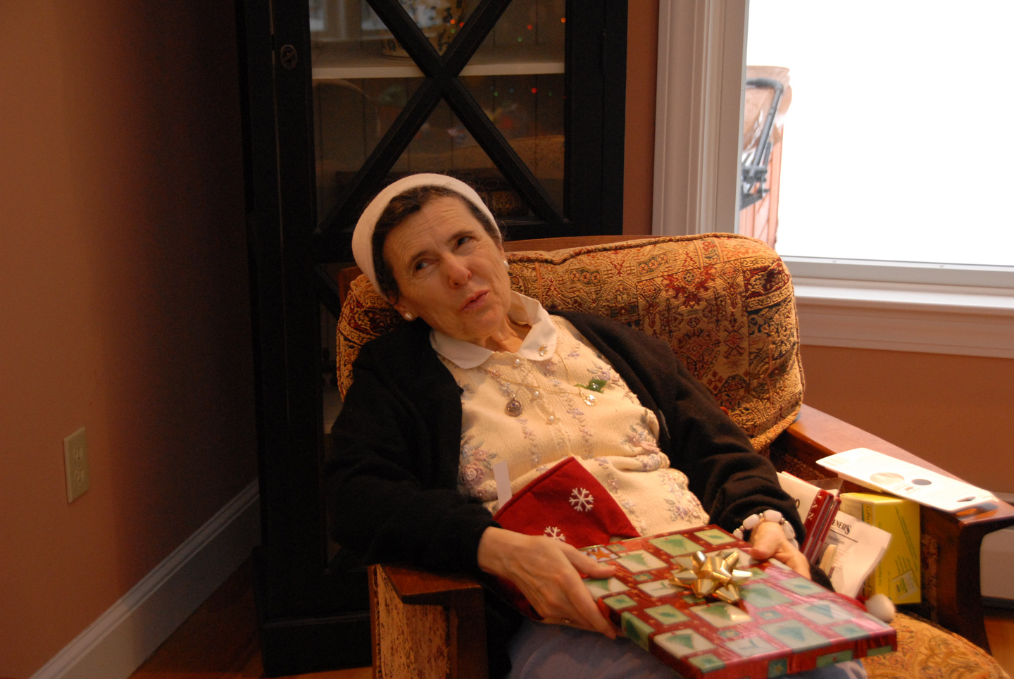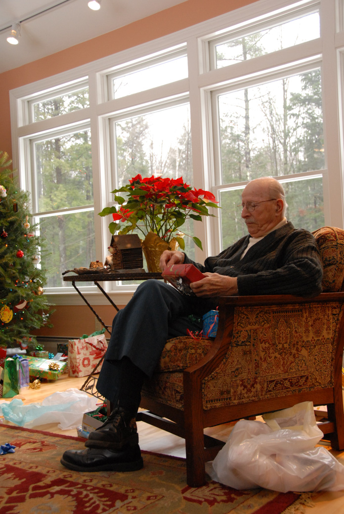 A few gift pictures. Keagan was insistent that we start opening the gifts prior to the meal. Keagan is an excellent gift-opener, and assisted many of us. 1st is Jimmy and Emily tackling a couple of gifts. Now here is Mom in a discussion on the festivities, about to open a gift.