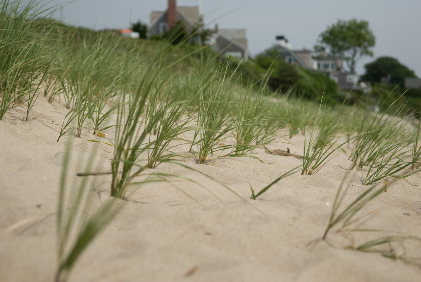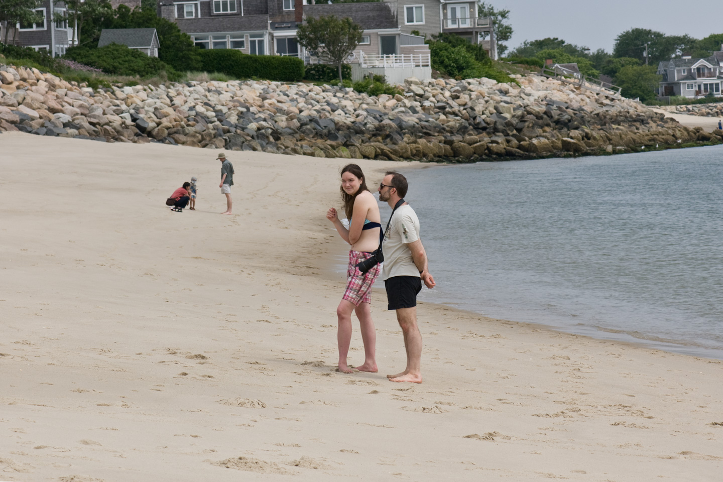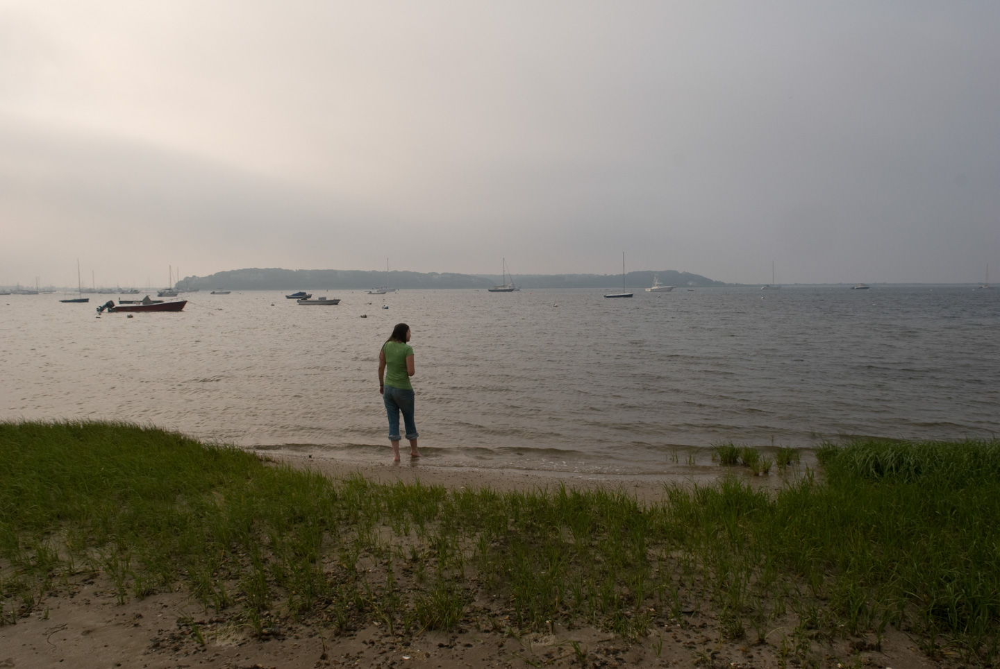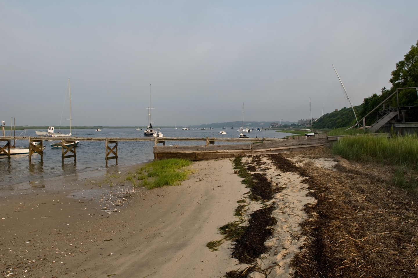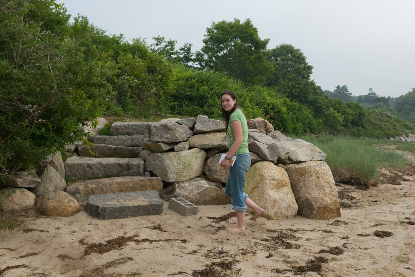 The house is on Stage Harbor, with some grass and flowers separating the house from the beach. Most mornings, at least some of us walked along that beach. Here is Emily on a morning walk we took. The stone stairway leads to another house along the harbor. The last picture is south of the house, looking up the waterway leading to Oyster Pond.