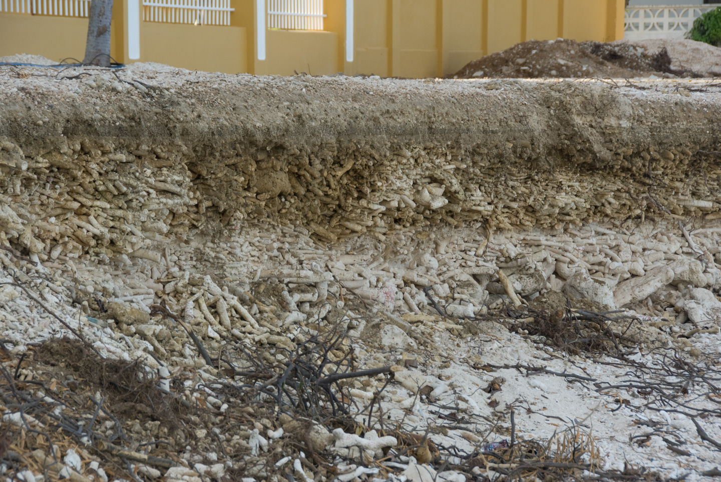 This is an interesting picture. The shore at Carib Inn has a small ledge; you can see the little wall and steps down in the pictures above. Well, in front of the building next to Carib Inn there is no wall, and the storm took off the front layer. What was exposed is the subsurface, which is: coral rubble. We saw the same thing in the downtown, although there is was mixed with a little more dirt than in this picture.