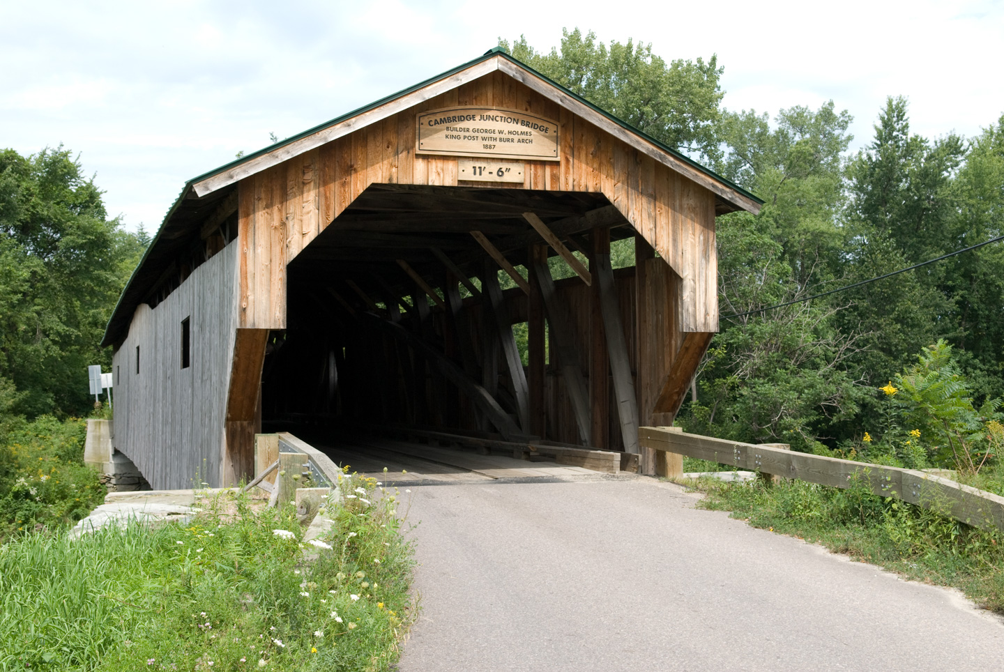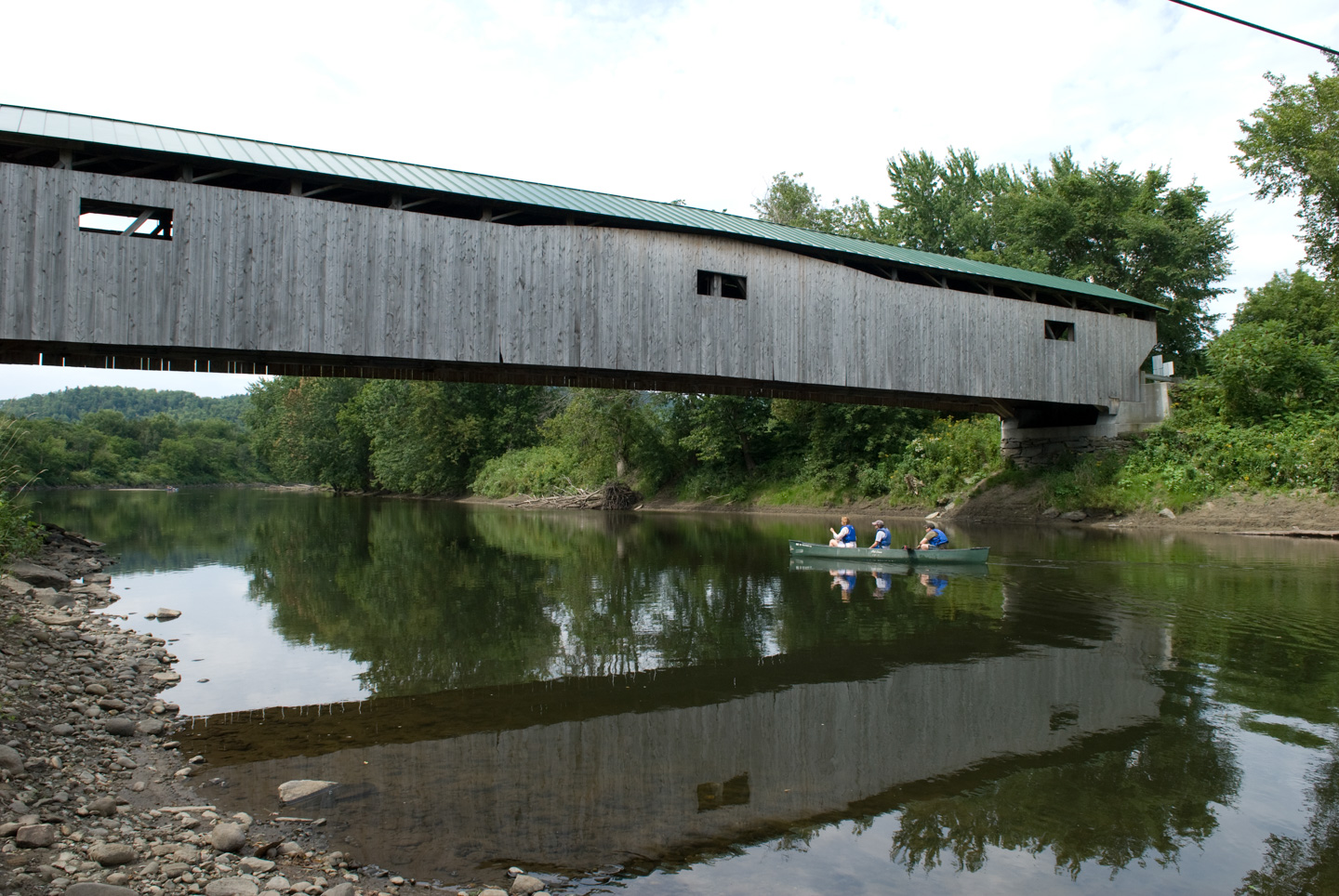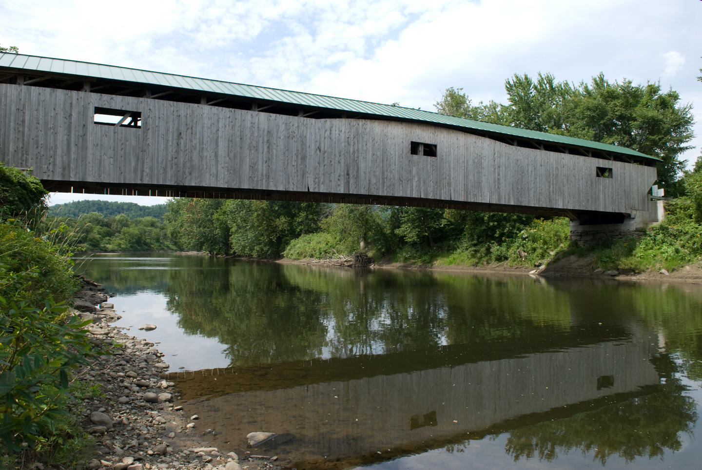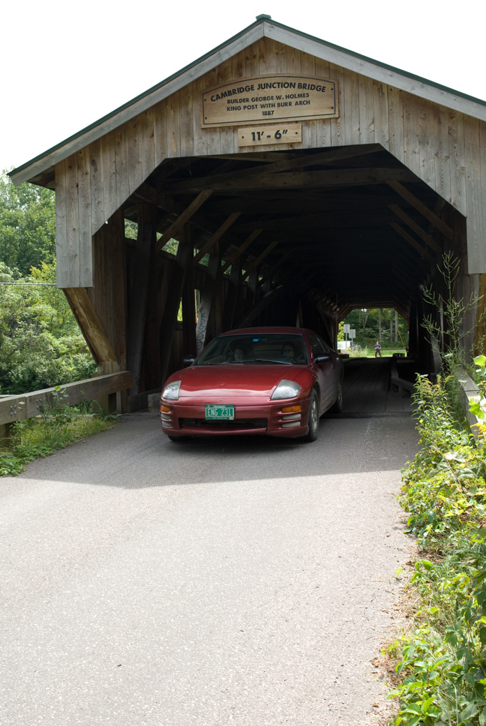 We stopped for lunch in Jeffersonville. We ate at 158 Main. While there, we picked up a tourist map of Jeffersonville and Morrisville. This goes along with the tourist map we picked up of Stowe. These maps are surprisingly good. They highlight advertisers, of course, but if you learn to read them they have a lot of other information on them as well. We decided to do a loop and drive back through Morrisville and then down again on Rte 100 back to Stowe. In Jeffersonville was a nice covered bridge over Lamoille River.