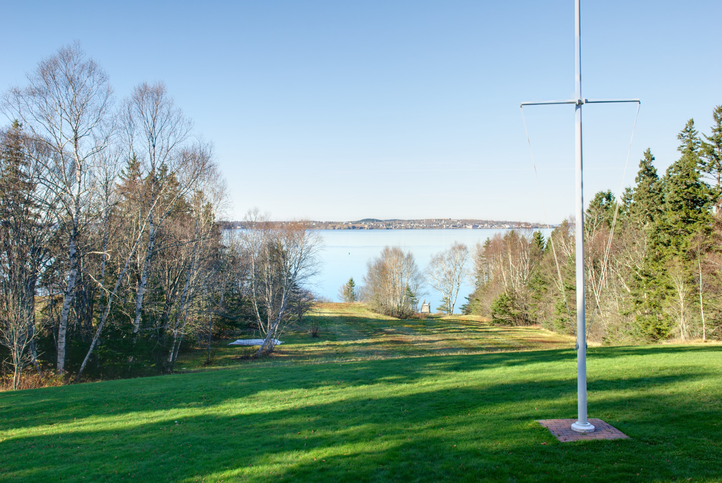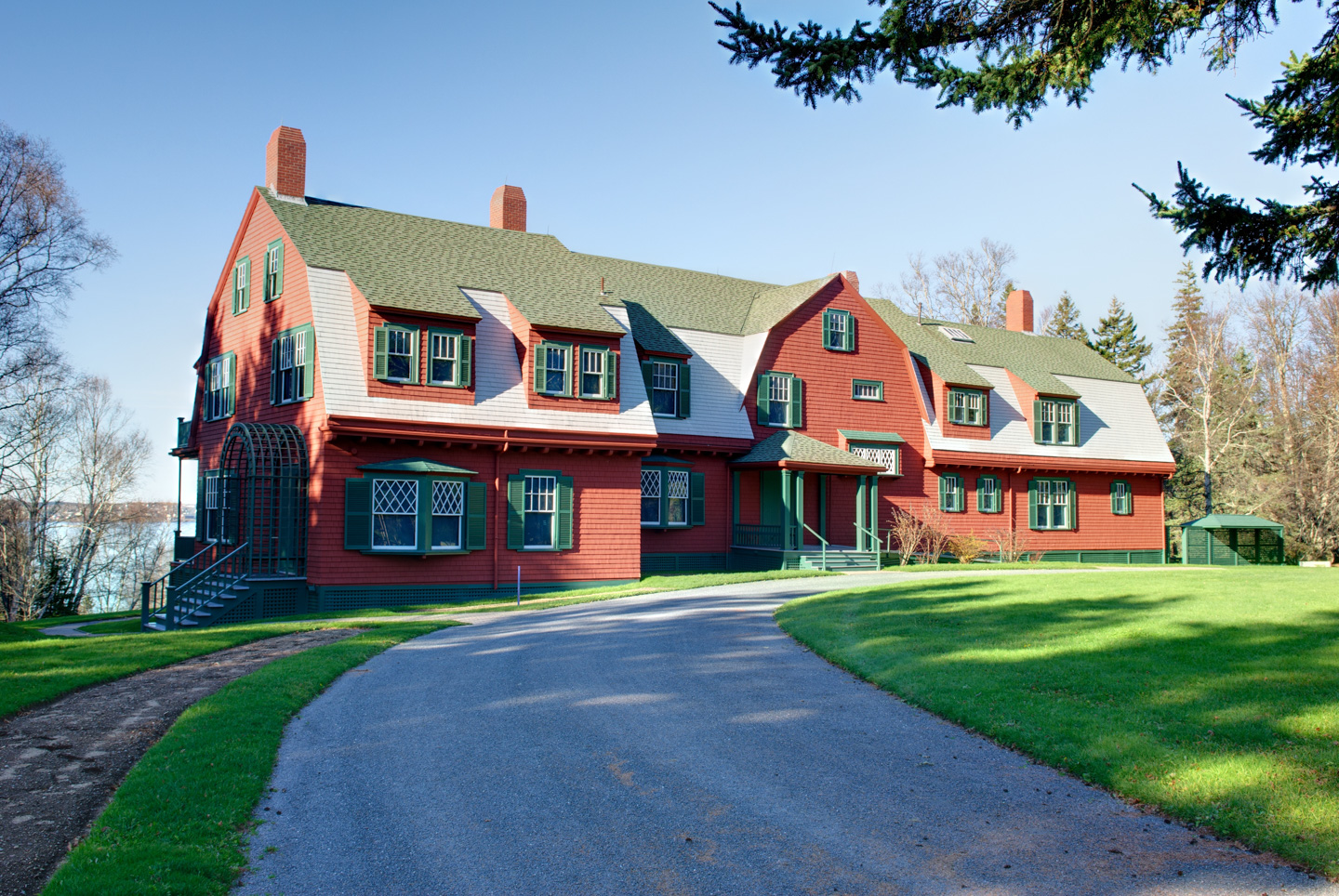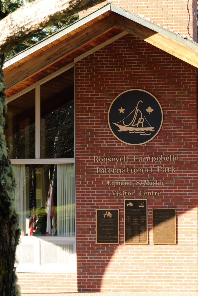 We ate a quick lunch looking out at the mud flats that were now covered by the incoming tide. While still a very nice view the bald eagles have all disappeared. It is early afternoon so off the Campobello we head. Canadian customs were very friendly and gave us a map of the island. First stop was FDR's summer cottage. We found it emotional to walk his grounds, stand where he did on his porch and take in the same ocean view. (In the distance is Rockport; we were even able to see the fisherman statue with our binoculars.) Everything was closed, but we were happy to be able to walk the grounds and snap pictures with no other people present.
