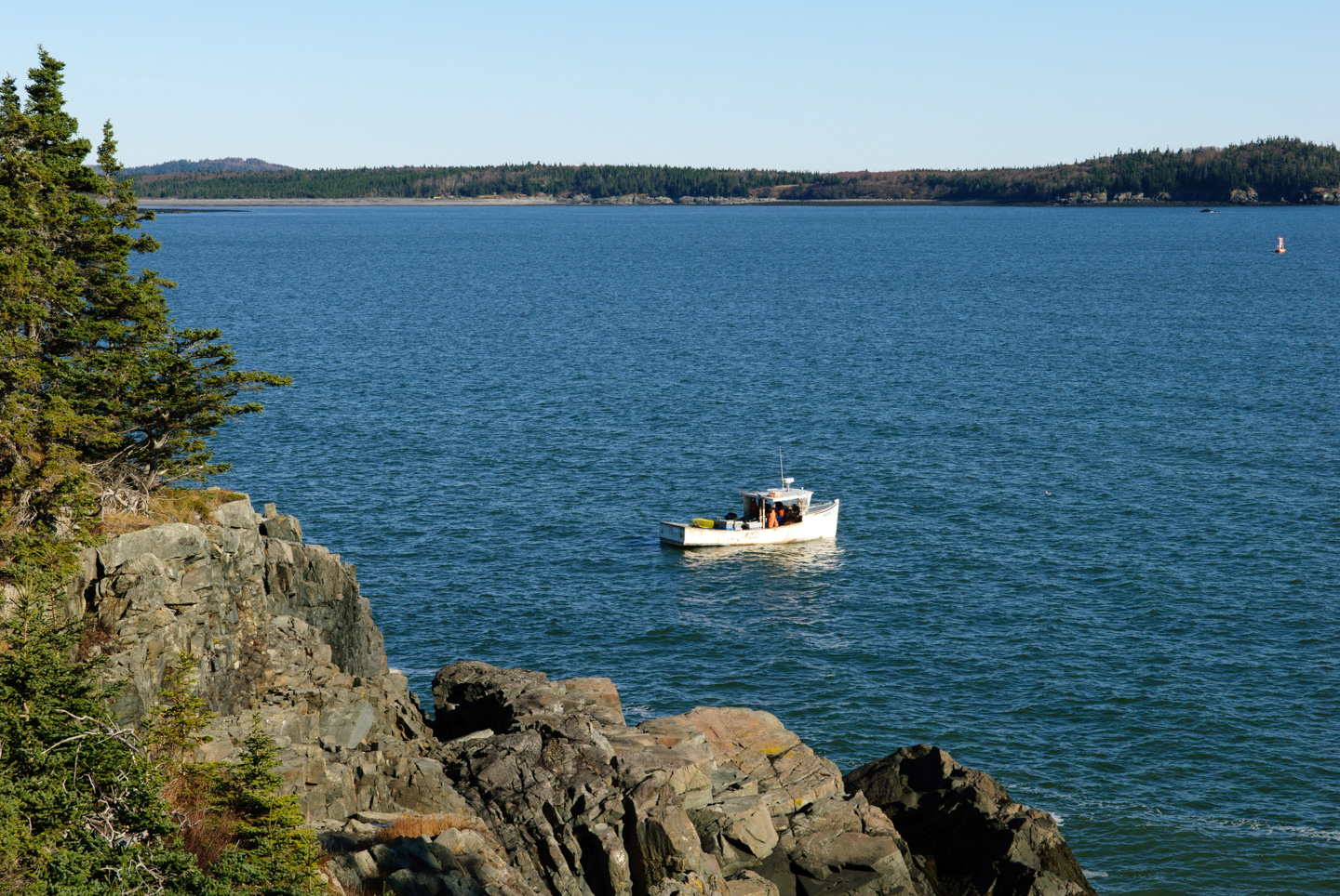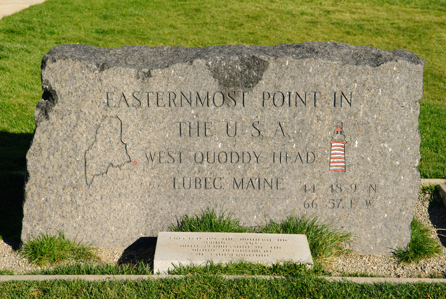 Then we arrived at the (West) Quoddy Head State Park. We were the first ones there so we had the Lighthouse photo opportunities to ourselves. Between us we got all the angles covered. This park is beautiful. We hiked all around both sides of the lighthouse, where we could see up across the bay into downtown Lubec, the Campobello bridge, Campobello Island, and also Grand Manan island. (The land in the distance in the picture with the boat is Campobello.) The hikes were through a mossy woods, with peaks out to the ocean. It was all very nice, however not as grand as the Bold Coast hikes yesterday that were magnificently beautiful.