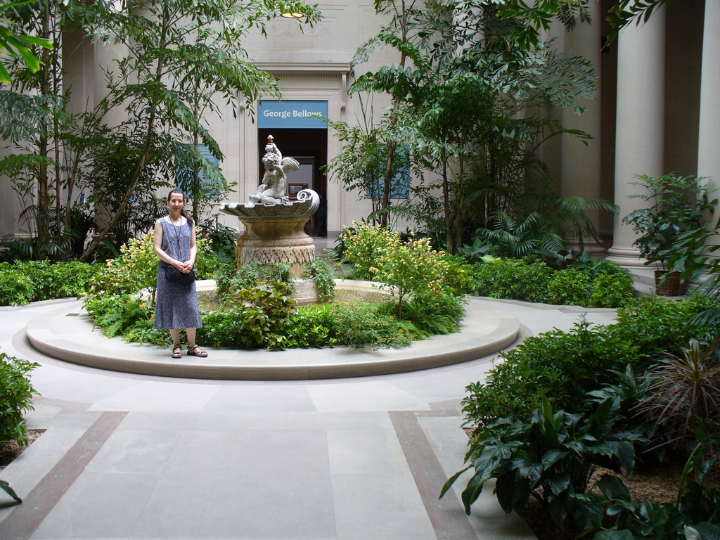 Here is Anne in the pretty East Garden Court. You can see the entrance to the George Bellows special exhibit behind me. Bellows is most famous for his boxing paintings, but was actually an extremely varied artist. Some of his interests were the social underclass, politics, family, coastal scenes, city life, and human rights. Some examples are The Lone Tenement, commenting on the side effects of modernizing and building a new bridge, causing housing losses. Blue Snow The Battery, with the enticing winter scene in the early light of day. Forth and Back, showing the motion of the ocean. Sea in Fog, a more impressionistic take on the ocean. The White Horse, which is at the Worcester Art Museum. We really like how that one draws your eyes down the path to the little house in the distance, even though the horse is the focal point. And one last one that I will mention: Mrs. T. Unlike some of his early portraits, and even some of his contemporary with this one, he really shows details of her face and hands.