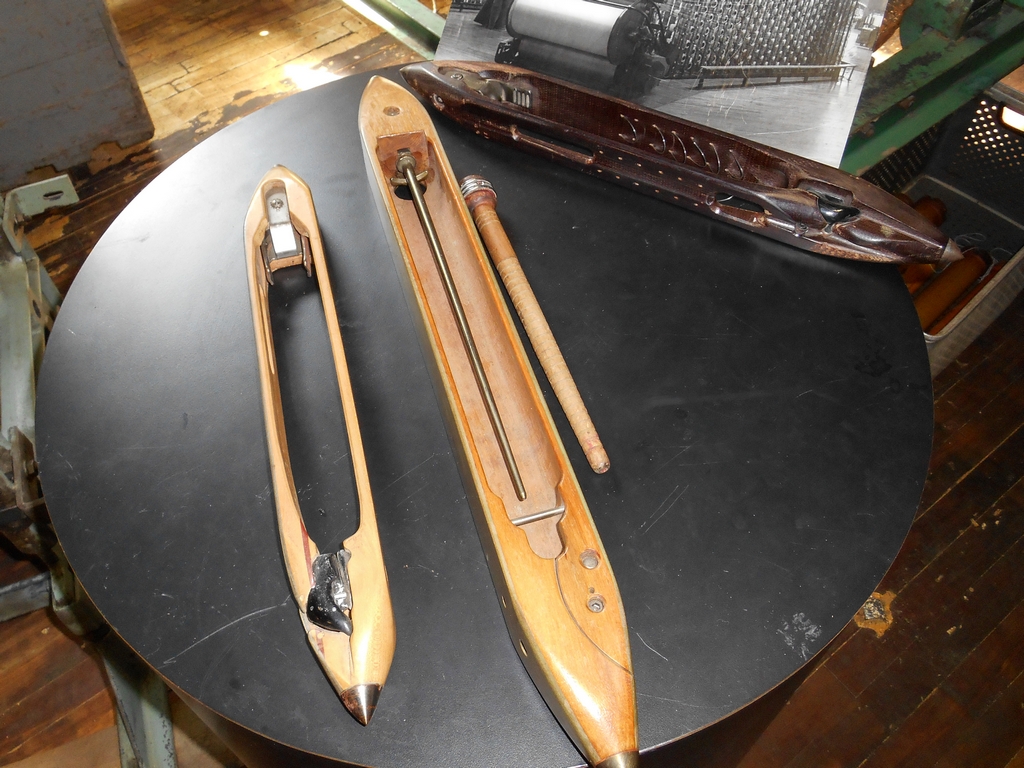 The shuttles that carry the thread back & forth on the looms have metal tips. Gerry told us that one time he stopped the loom to replace thread, but one of the shuttles was in the middle. When he restarted it, the other loom hit the 1st one ... and they went flying off! Think of one of these as a projectile. Luckily, he wasn't injured (he was the only person in the room at the time).