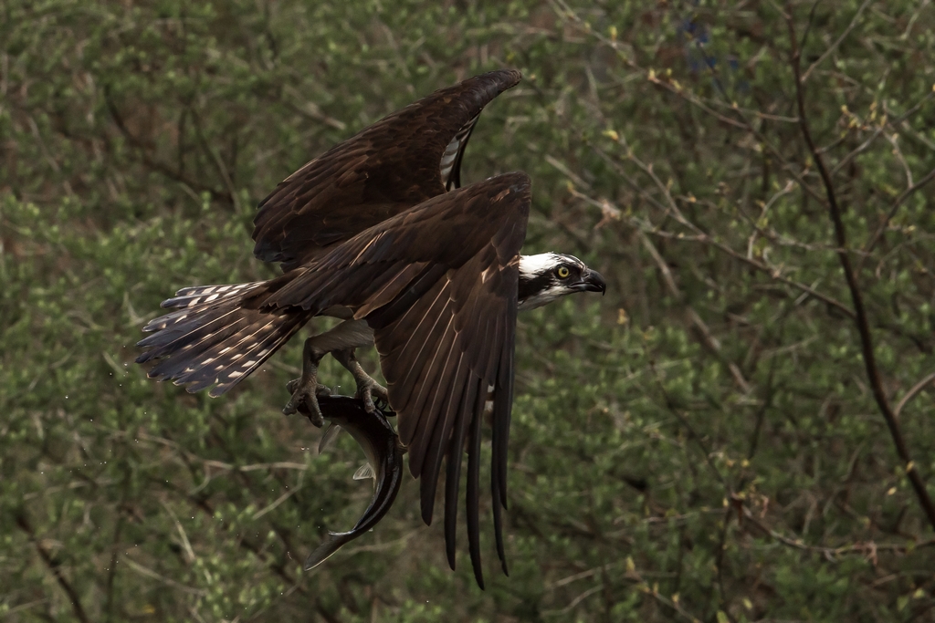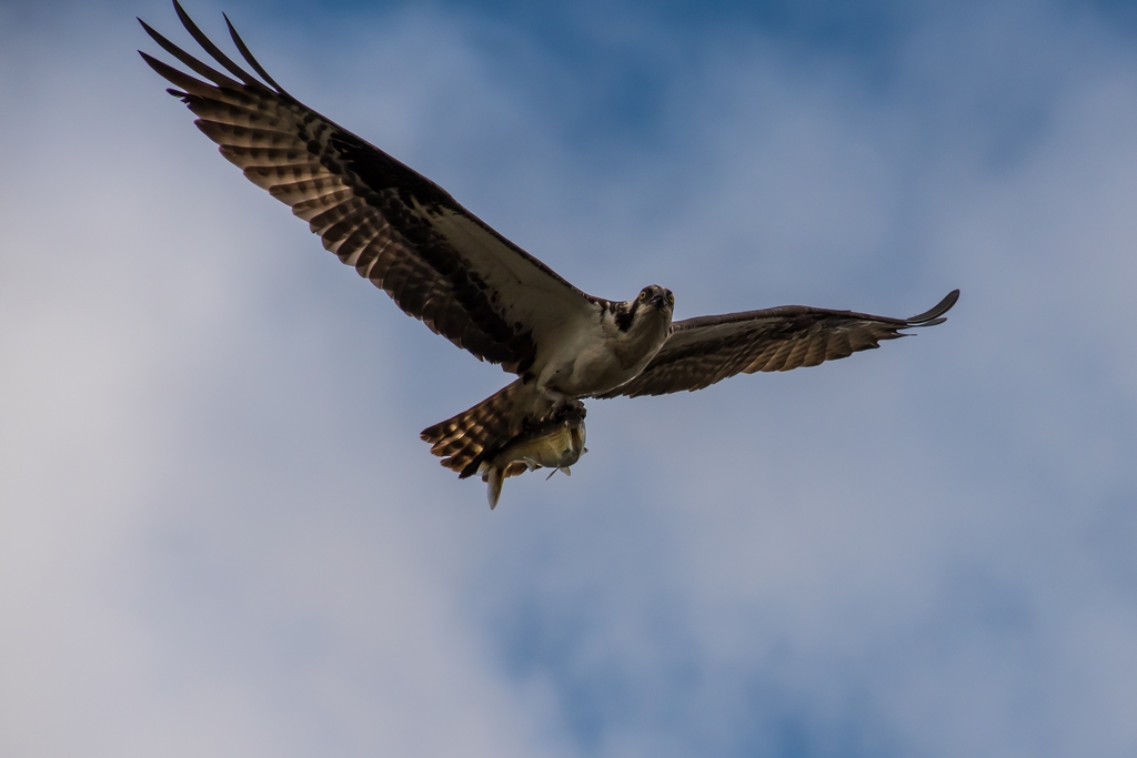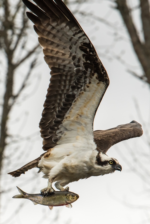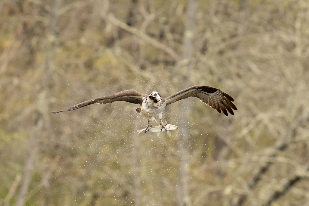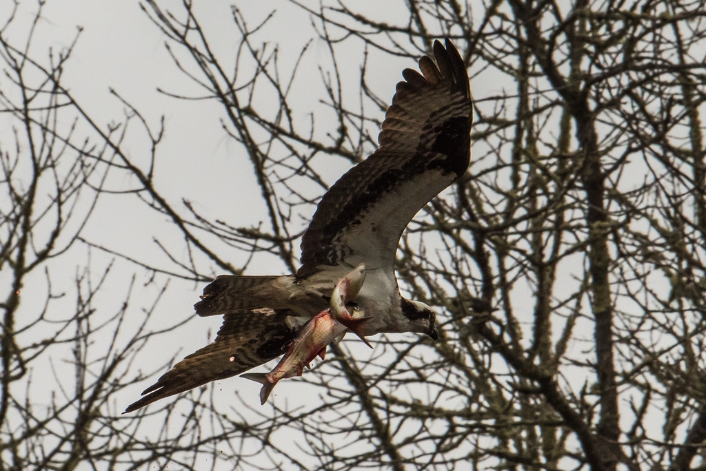 Every dive we saw was successful. The Osprey would hover and identify a fish before making their dive. As we stood there, Anne said in amazement to Paul "That Osprey has 2 fish!" Paul gave her that expected you-are-crazy look. Except when we got back, a picure proved that yes, that Osprey had 2 fish in its talons. This next picture is not for the squeamish; you might want to scroll down quickly to the picture after that if you are. And yes, those are drops of blood falling from the fish.
